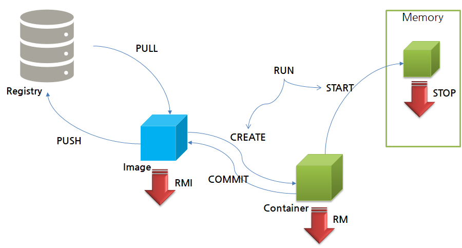 - Registry <=push/pull=> Image <=commit/create=> Container -start-> (실행) -stop-> (종료)