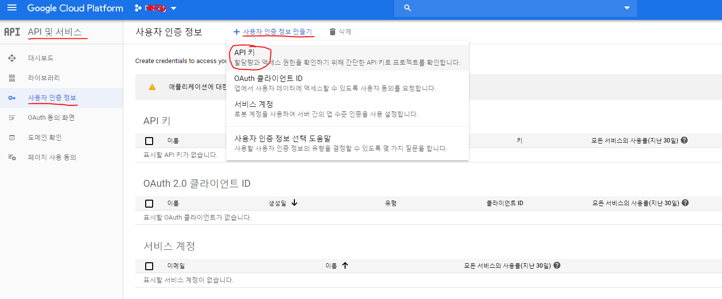 - (참고로 GCP의, "API 및 서비스"에서 API Key를 발급받을 수 있음)