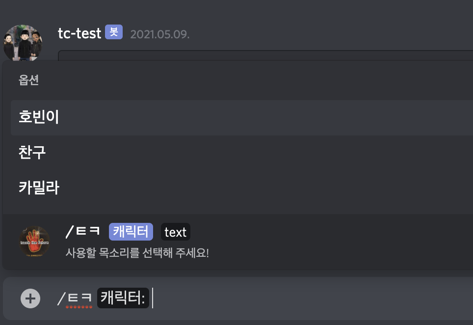 #아래와 같이... 이상한(?) 형식으로 요청 할 수 있다. url = "https://discord.com/api/v8/applications/<app_id>/commands" header = {"Authorization": "Bot 123456"} body = { "name": "테스트", "options": [ { "name": "옵션", "type": 3, "required": true, "choices": [ {"name": "호빈이","value": "호빈이"}, {"name": "찬구","value": "찬구"}, {"name": "카밀라","value": "카밀라"} ] }, { "name": "작성글", "type": 3, "required": true } ] }