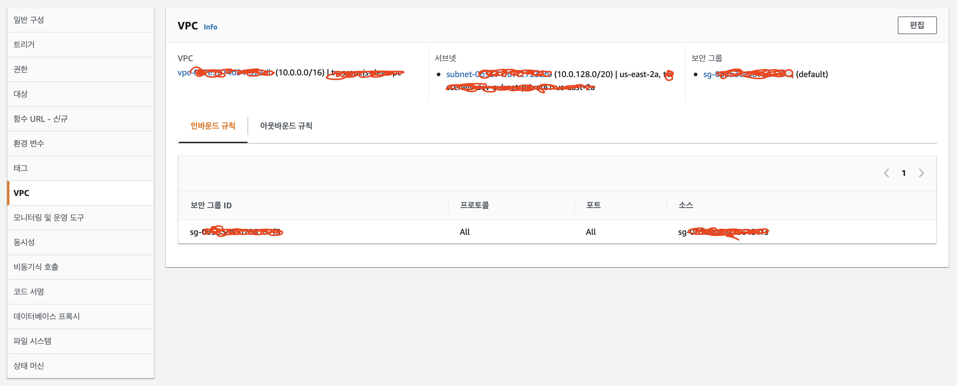 - vpc 마법사 -> 디폴트값으로 생성 -> 람다 -> vpc 설정 → vpc 선택 및 private Sub 2개 및 보안그룹 → 테스트 → 안됨?!?!