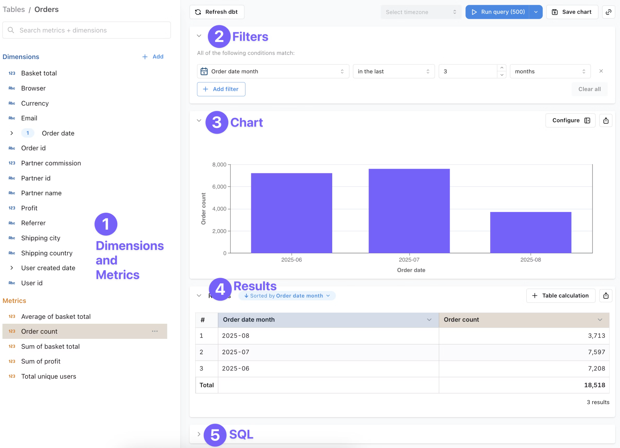 - 'Filters', 'Chart', 'Results', 'SQL' 을 사용.