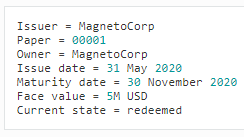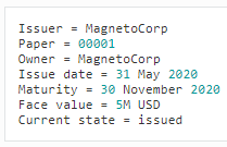 - Txn=issue;Issuer=MagnetoCorp;Paper=001;Issuetime=2020/05/31;Maturitydate=2020/11/30;Facevalue=5M$;
