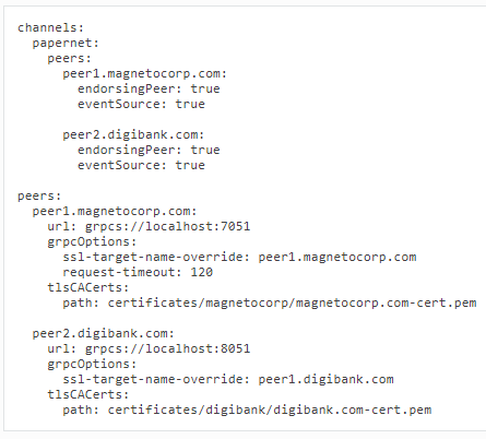 - 위 그림에서 'channels:'을 살펴보자면... 네트워크 channel으로 "papernet" 이고, peer으로 "magnetocorp 및 digibank" 입니다.