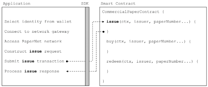 - "const contract = await network.getContract('papercontract', 'org.papernet.commercialpaper');"